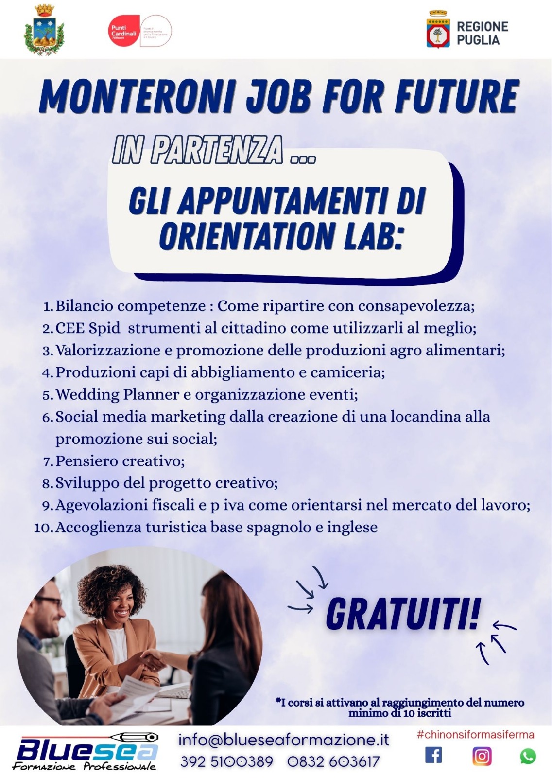 Si comunica che sono aperte le iscrizioni ai corsi di formazione professionale gratuiti organizzati in occasione del progetto "Monteroni job for future" ammesso a finanziamento  nell'ambito dell' Avviso Pubblico “PUNTI CARDINALI FOR WORK".