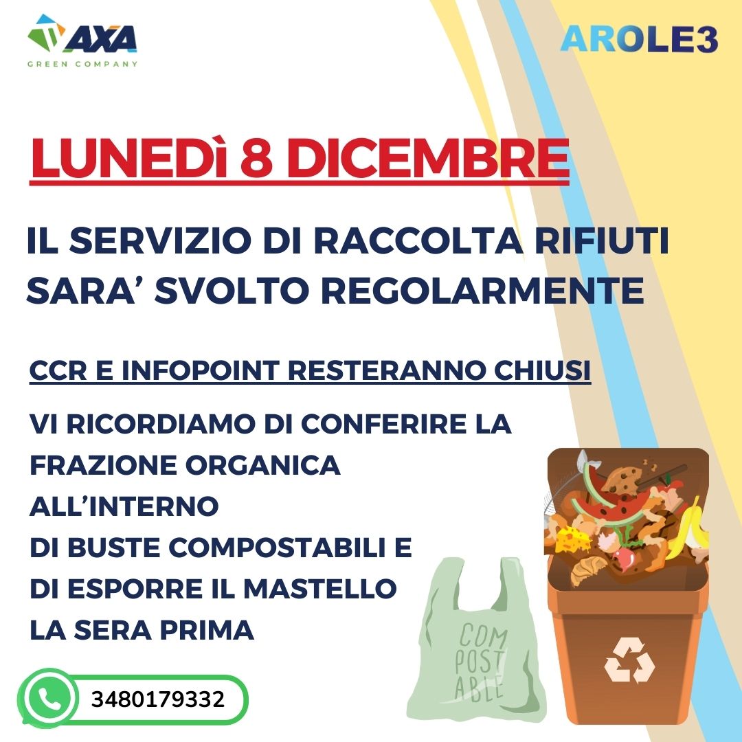 Nella giornata di Lunedì 8 Dicembre 2025 il Centro Comunale di Raccolta rifiuti (CCR) e l'INFOPOINT resteranno chiusi.
